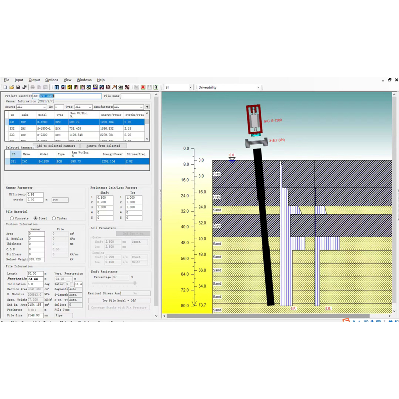 功能強,用戶界面友好。新增加的功能提高了樁身應(yīng)力、承載力、錘擊數(shù)和打樁時間的預(yù)測精度。