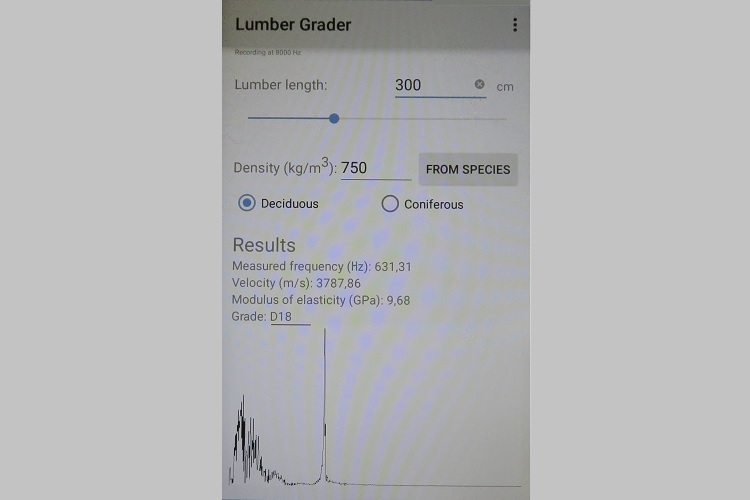 共振木材分級(jí)計(jì)是一個(gè)簡(jiǎn)單的工具。它由一把錘子和一個(gè)帶有專門(mén)軟件的Android手機(jī)或平板電腦組成。用戶輸入長(zhǎng)度、選擇樹(shù)種,木材分級(jí)計(jì)將采用該樹(shù)種的平均密度,用于可以覆蓋已有的密度值。然后敲擊木材的端部基于EUROCODE338標(biāo)準(zhǔn)的分級(jí)即顯示在屏幕上。由于密度的不確定性,該分級(jí)僅作為參考信息。